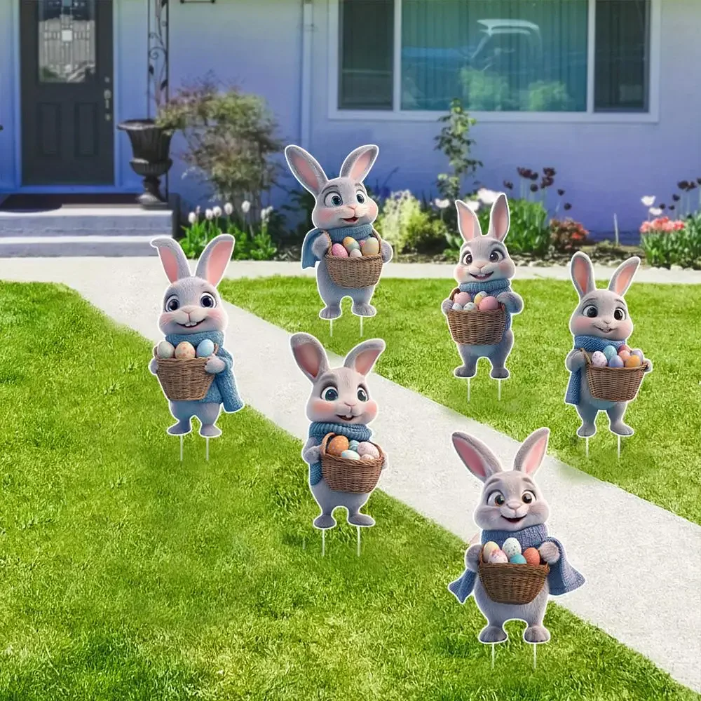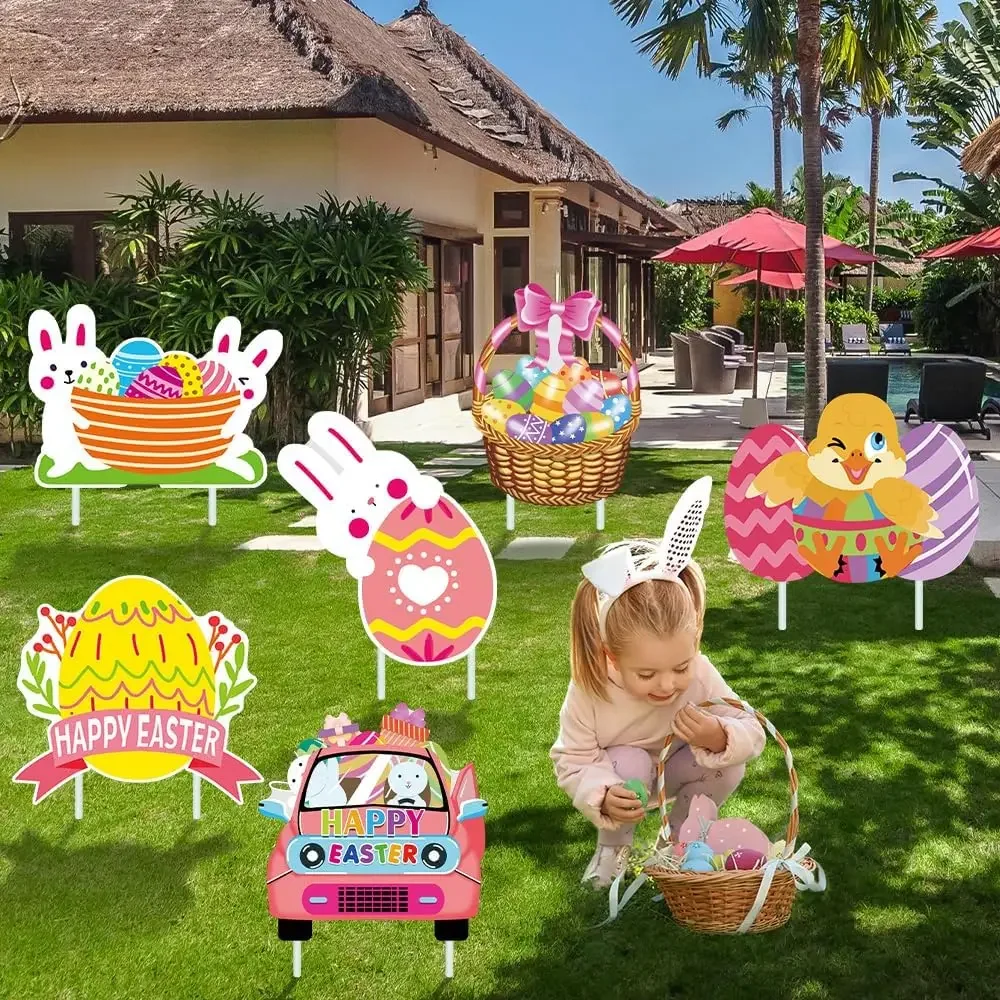 6 Pcs Easter Yard Signs with Stakes - Bunny Eggs, Basket, Chicks-Easter Lawn Decoration Easter Props Spring Patio