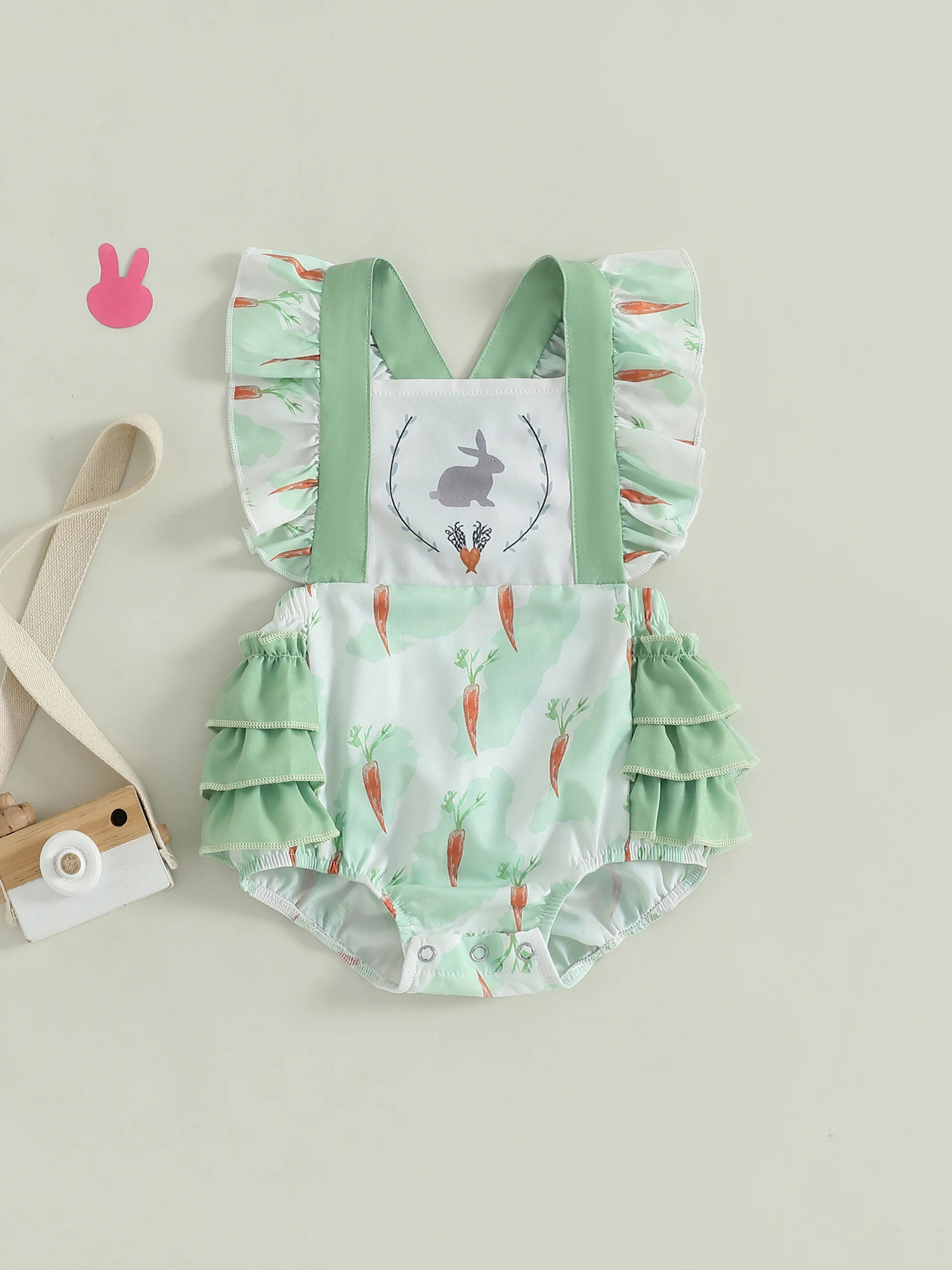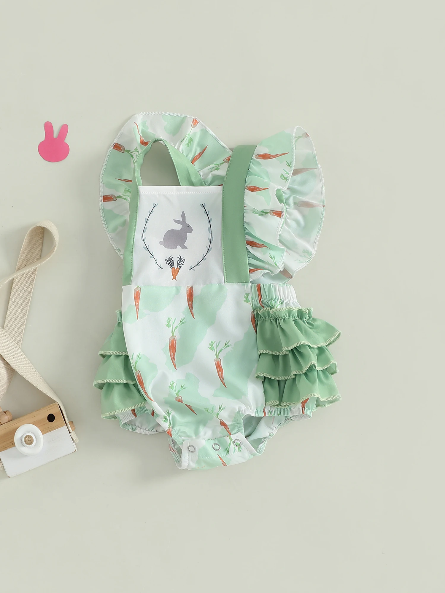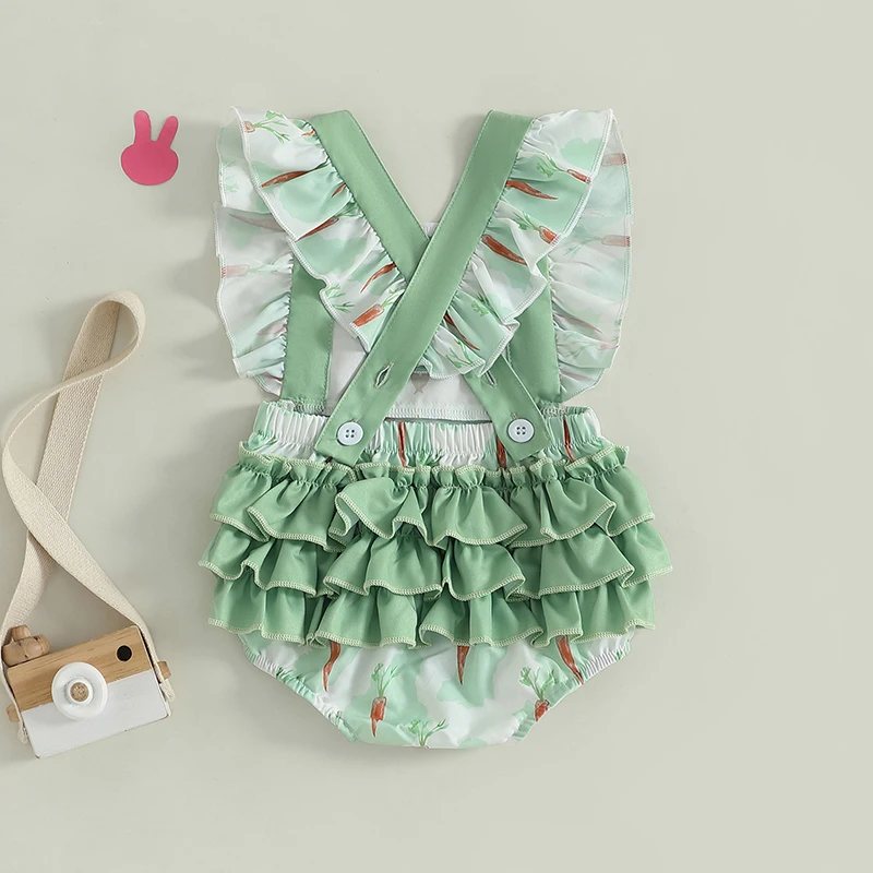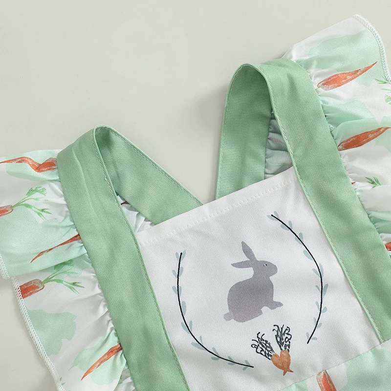 Adorable Infant Easter Jumpsuit with Cute Bunny and Carrot Print Sleeveless Ruffle Square Neck Baby Girl Outfit for Newborns