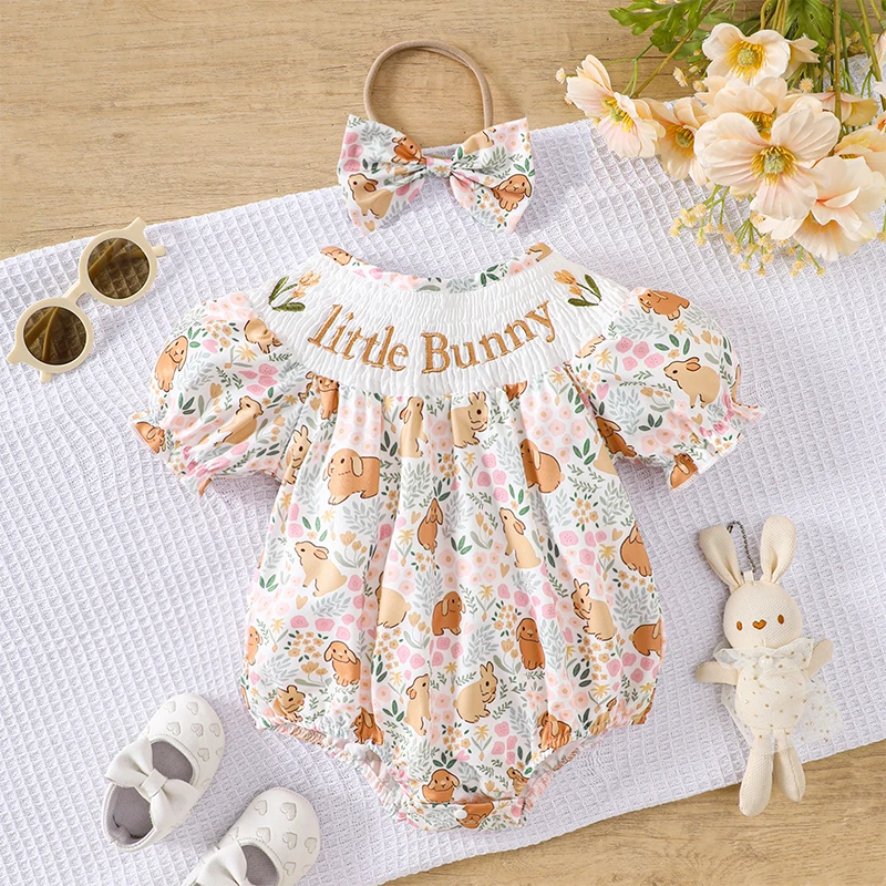 Adorable Infant Easter Jumpsuit with Cute Bunny Embroidery Short Sleeves Round Neck and Matching Bow Headband
