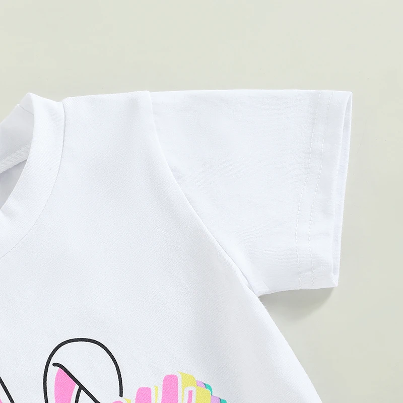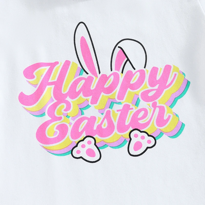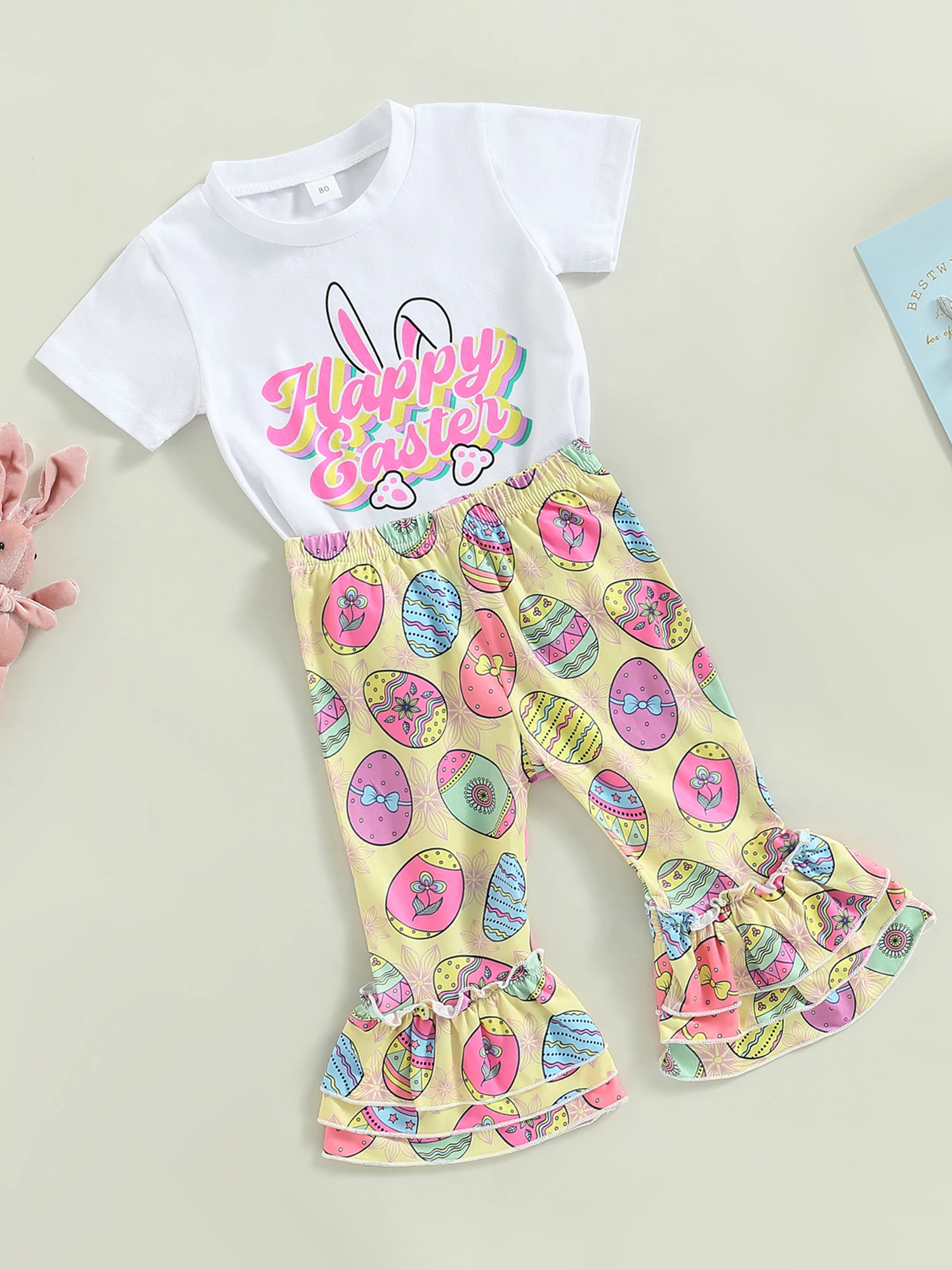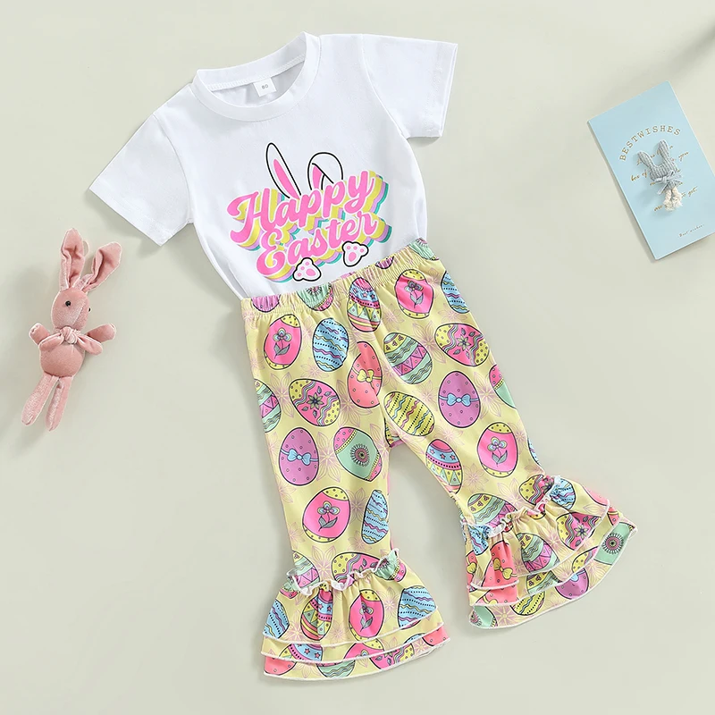 Easter Kids Girls Clothes Suits Letter Rabbit Print Short Sleeve Crew Neck T-Shirts and Eggs Print Flare Pants 2Pcs SetsSize chart:(cm/inch)
