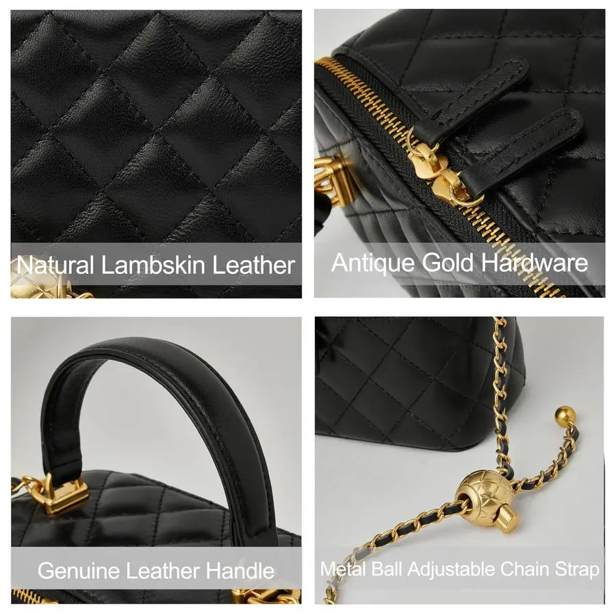 Structure Vintage Quilted Design With Square Box Shape. Two Zipper Closure Opening. Interior Including Three Credit Card Slots And One Earphone Lipstick Holder. Come With One Adjustable And Detachable Metal Ball Chain Strap