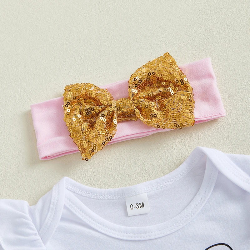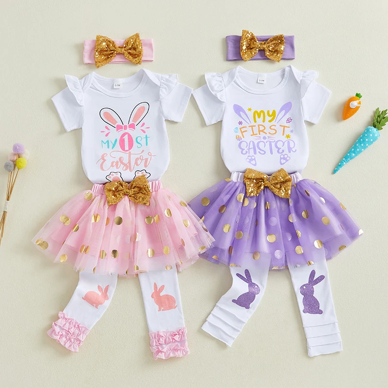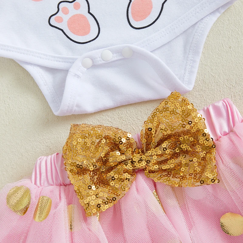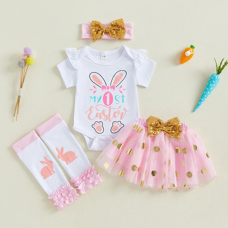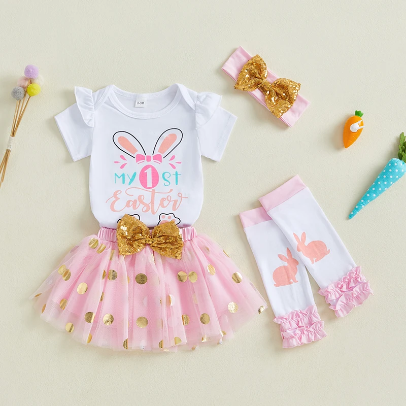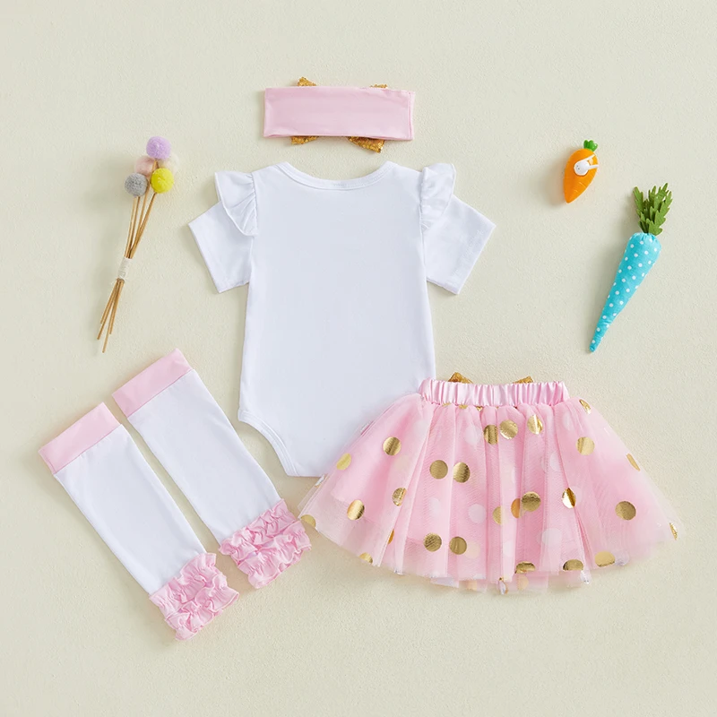 Baby Girl Easter Outfit Bunny Long Sleeve Romper Gold Dot Tulle Skirt Bow Headband Leg Warmers Spring SetSize (cm)
