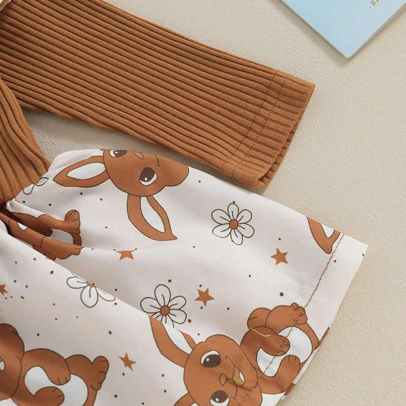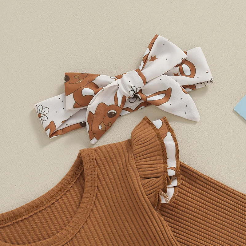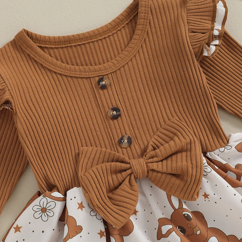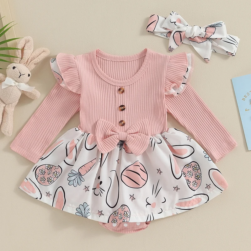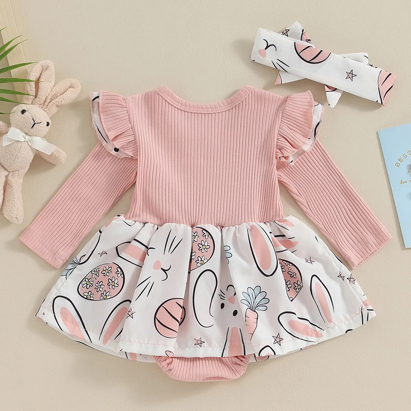 Baby Girl Easter Outfit, Long Sleeve Crew Neck Bunny Flower Print A-line Romper Dress with Headband Clothes