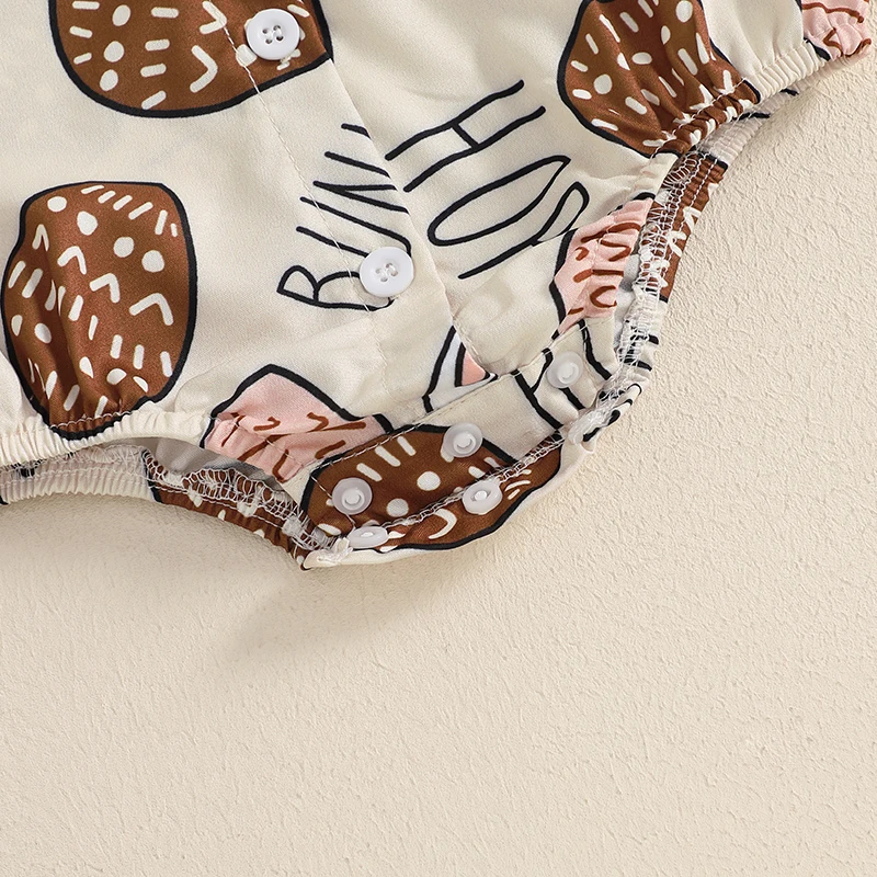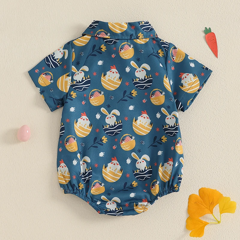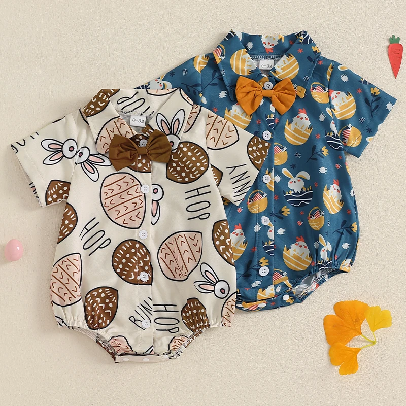 Baby Boy Easter Romper Egg Bunny Short Sleeve Lapel Neck Button-up Spring Jumpsuits with Bow Tie